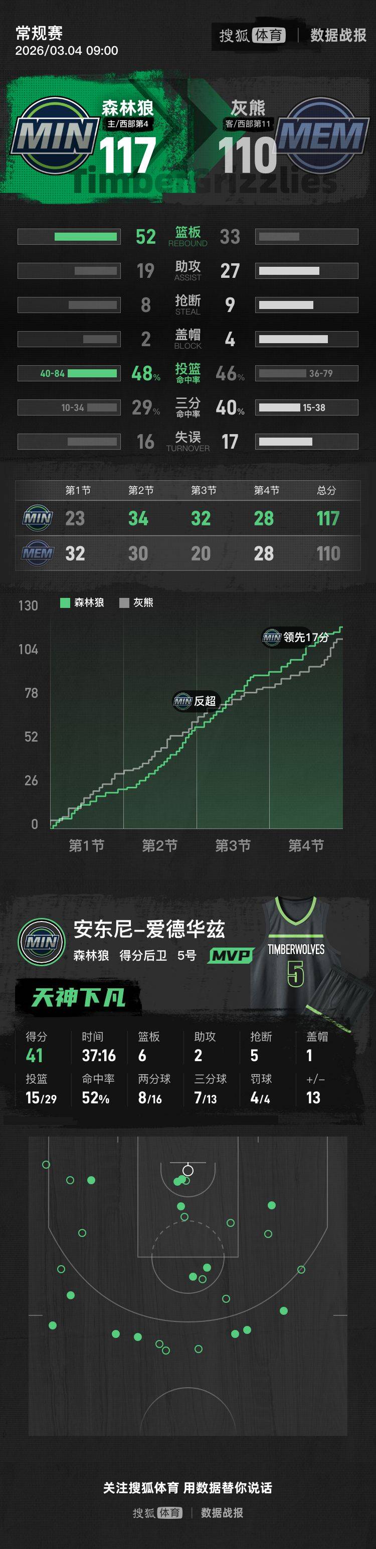 进入第四节,森林狼继续保持良好的竞技状态,开局打出一波进攻,将优势扩大至17分。灰熊在节中阶段展开反击,将分差缩小至4分。然而,森林狼保持着稳定的进攻节奏,逐步将优势再次拉开。爱德华兹在本节中贡献了13分,其中包含了三记三分球,而灰熊的考沃德也获得了10分,包括一记三分球。最终,森林狼以117-110赢得了比赛。